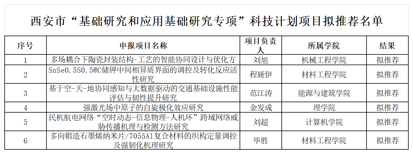 根据西安市科学技术局《关于开展2026年度市级“基础研究和应用基础研究专项”科技计划项目入库储备的通知》要求,我校限报6项,经学校积极动员、各单位组织项目负责人申报、邀请校外专家评审,拟推荐“多场耦合下陶瓷封装结构-工艺的智能协同设计与优化方法研究”等项目,现将拟推荐项目进行公示,具体信息如下: